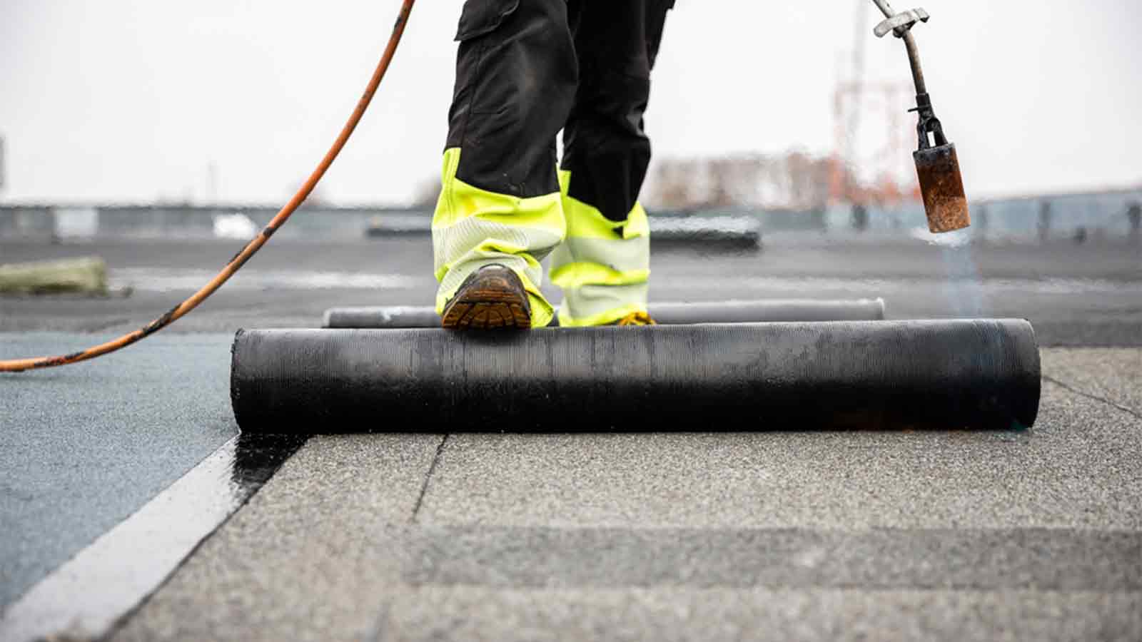 Professional bitumen waterproofing on a flat building, flat roof repair in Boston, flat roof installation residential building