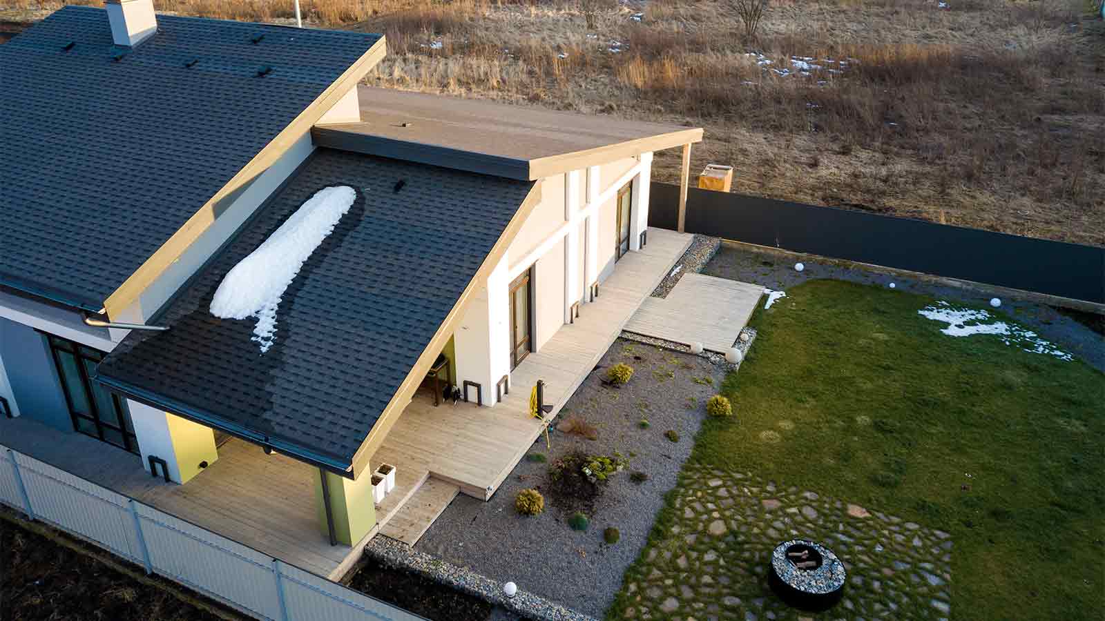 Aerial top view of new residential house cottage and terrace with shingle roof after winter, spring roof inspection