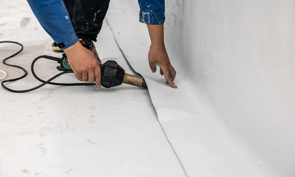 PVC membranes require heat-fusion welding at seams, not adhesive patches. Our calibrated welding equipment creates stronger seams than original standards, resisting separation through freeze-thaw cycles and UV exposure.